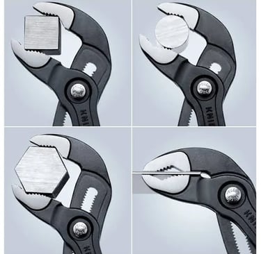 Spre deosebire de cleștii tradițonali de tip Stillson sau de alte clești ajustabile, Knipex Cobra folosește un mecanism cu dinți paraleli care îți oferă o prindere fermă și uniformă pe toate tipurile de piese: țevi, piulițe, racorduri sau alte suprafețe.